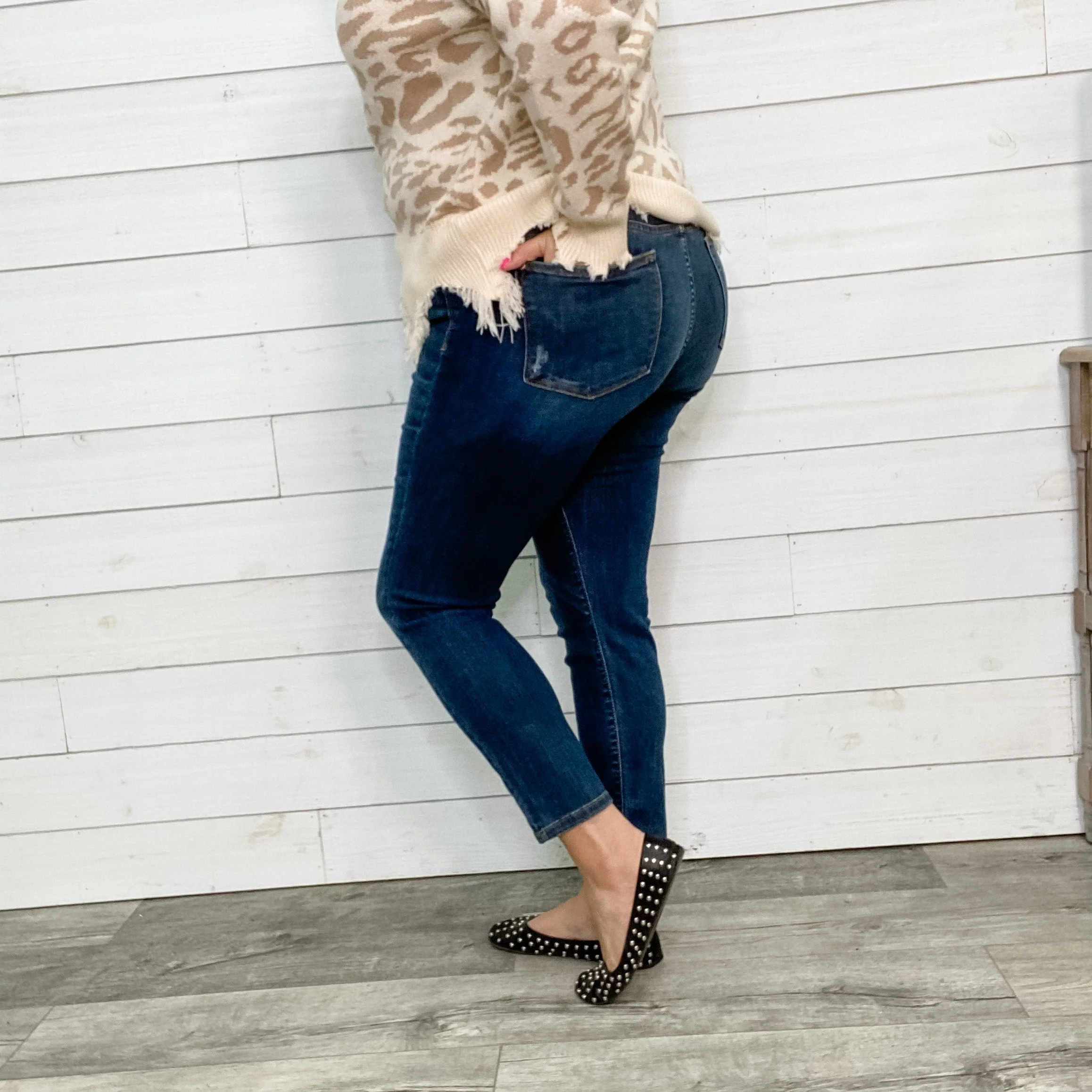 New AND Improved! Our best selling relaxed fit jean (slightly roomy skinny) is NOW available in 3 inseams! Ash is 30 inches from crotch to ankle in photos. In the studded shoes she is wearing the OG 27 inch we have restocked so many times! And in the blue shoes she is wearing the 29 inch inseam.Â
